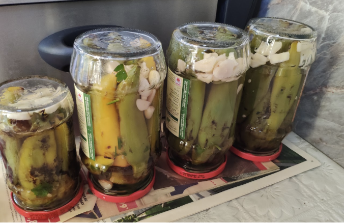 Сваряваш вода в каната. В буркана (от голяма лютеница Дерони) нарязваш 3-4 скилидки чесън, после редиш пуканите чушляци плътно в буркана, отгоре слагаш щипка нарязан магданоз, в/у него 1 ч.л. сол и 1 ч.л. захар. Заливаш с оцет, докато стане 2 пръста от дъното на буркана, после доливаш с водата от каната. Затваряш капачката си готов. В следващите часове обръщам бурканите няколко пъти, да се хомогенизира разтвора. На другия ден можеш да ги ядеш! 🙂